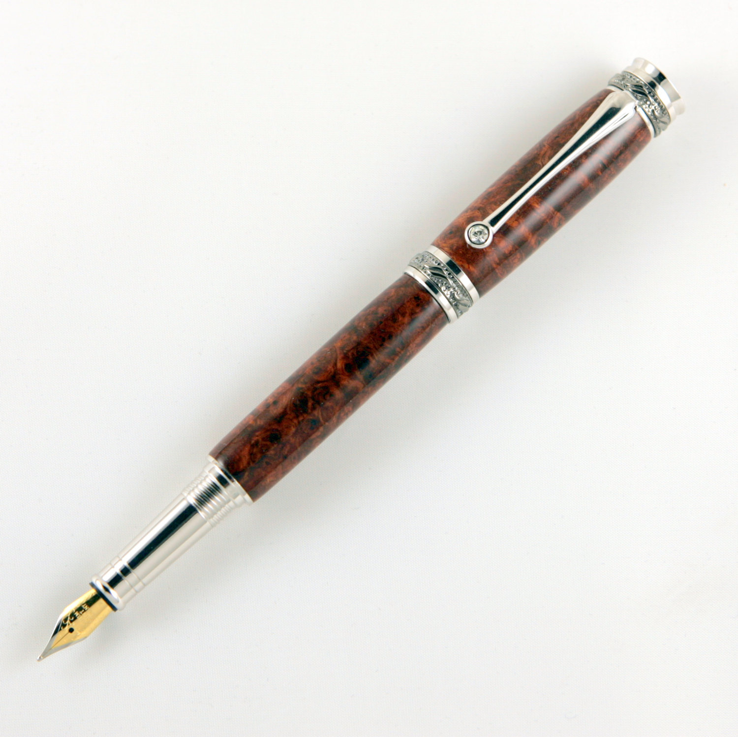 This high-end majestic pen is made out of beautiful amboyna burl and has a cyanoacrylate finish which gives it a beautiful high gloss finish that will never wear or fade. The pen hardware is plated with rhodium and black titanium nitride. Available in rollerball and fountain style.
