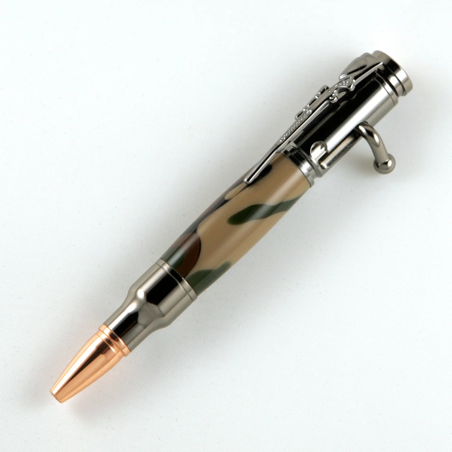 This pen is made from genuine deer antler. The clever design allows the refill to advance and retract by cocking the lever.