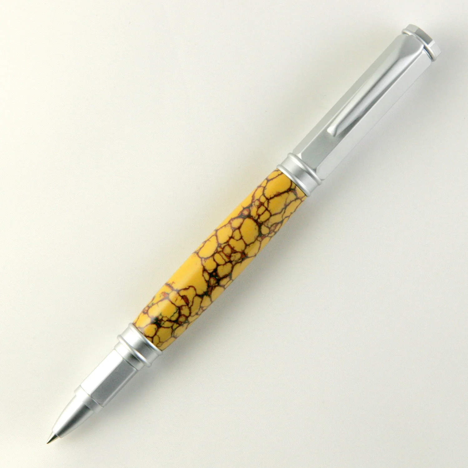 This pen is made with a beautiful stone resin that is composed of over 80% real stone. What makes this pen truly mesmerizing is it's unique magnetic cap. The cap easily posts magnetically onto the nib and back of the pen without the use of threads. Fountain pen includes a premium Iridium nib, an ink pump, and a disposable black ink cartridge. Rollerball pen includes a Schmidt rollerball refill.