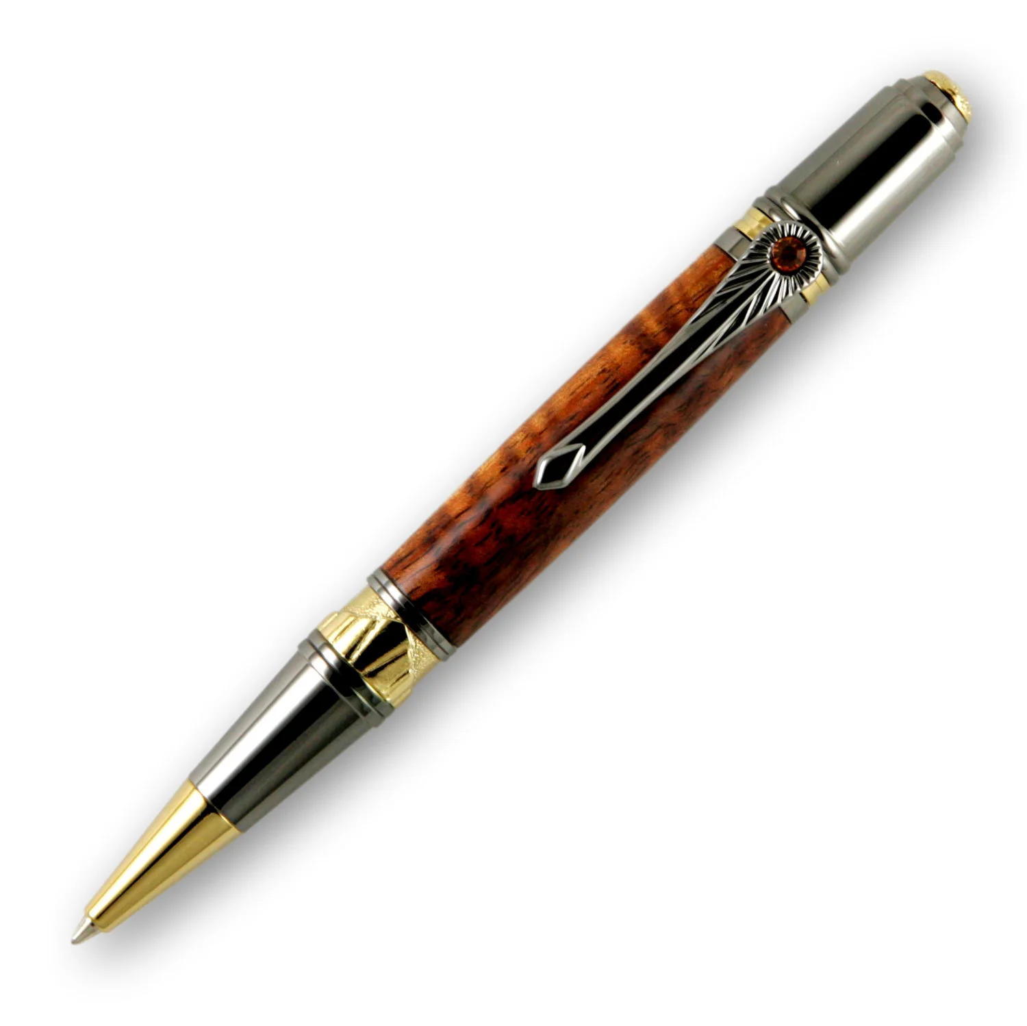 This is a shorter pen that fits comfortably in the hand and has a solid feel. The beautiful hand-turned Hawaiian Koa is finished with an acrylic layer that will never wear or fade. The pen features a sparkling Swarovski crystal set in the clip that completes this pen's appearance. The pen components are plated with high-quality Gold TN and Black TN.
