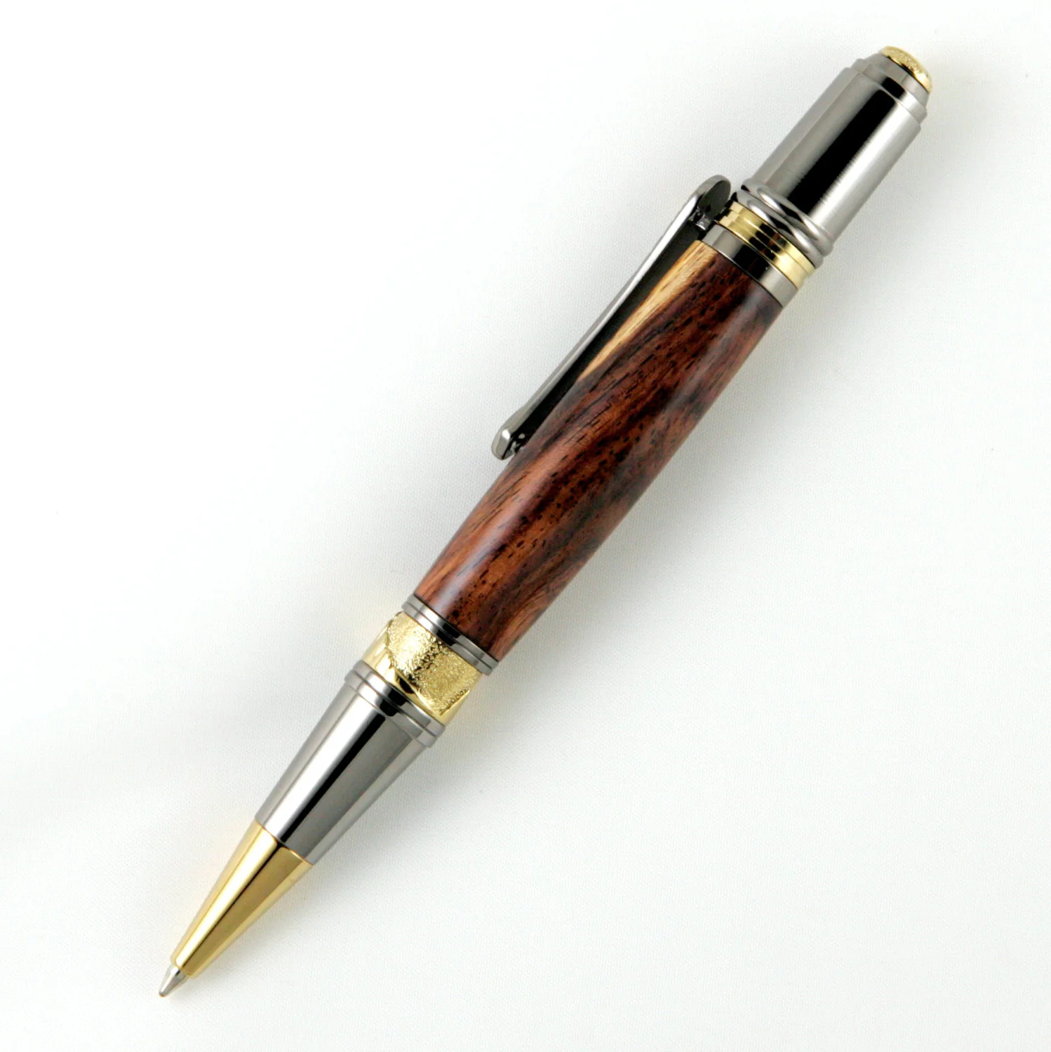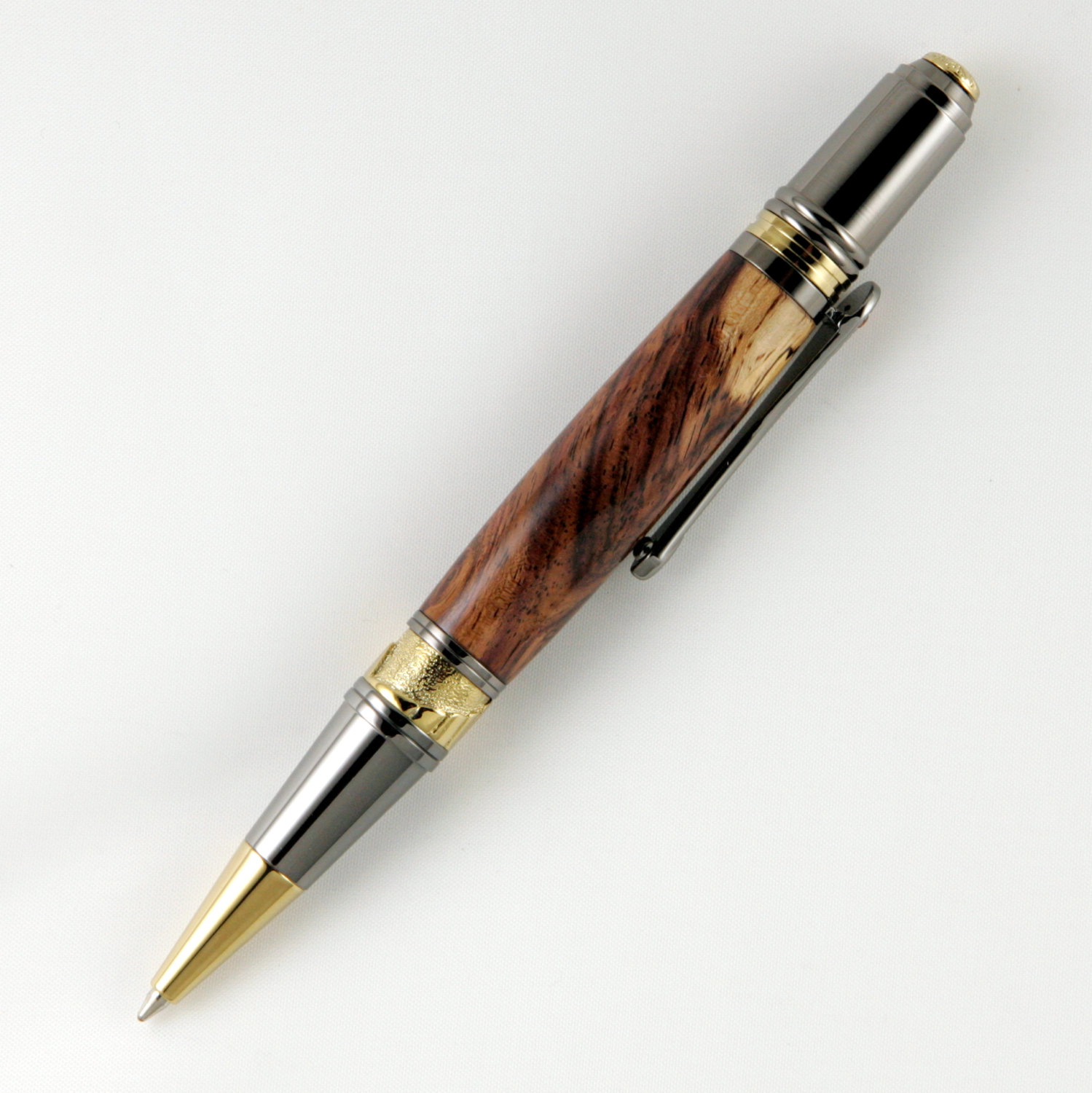 This beautiful pen made from Honduran Rosewood Two-Tone Burl has a CA finish that will never wear or fade. The pen components are plated with high quality Gold TN and Black TN.