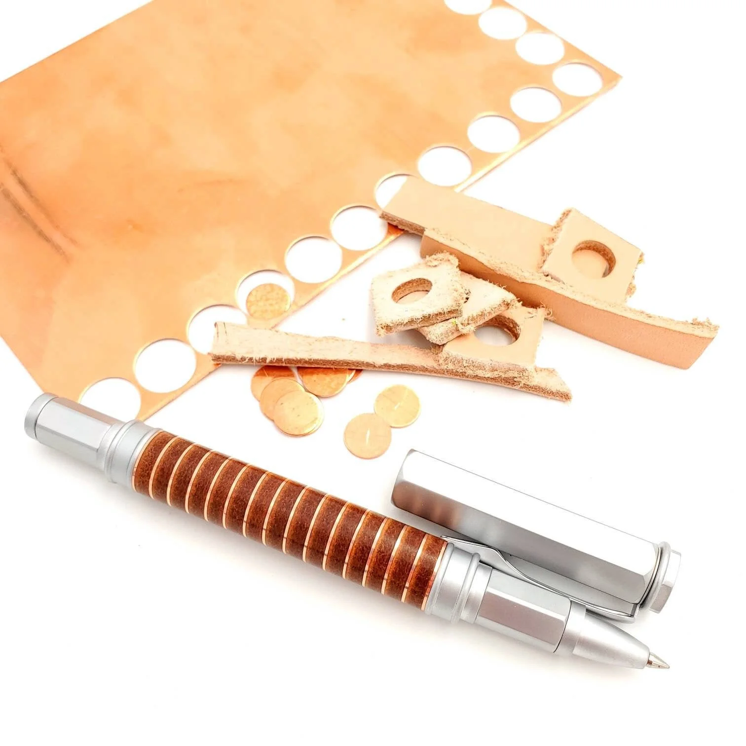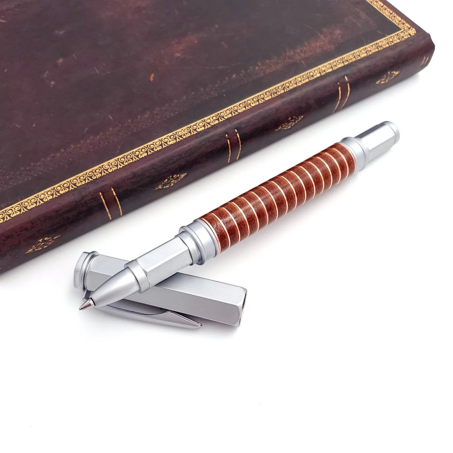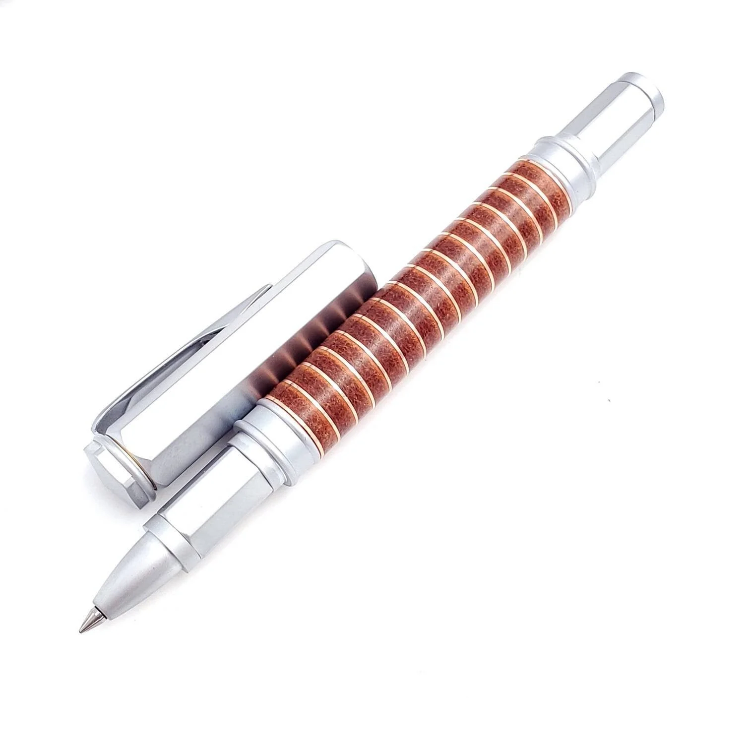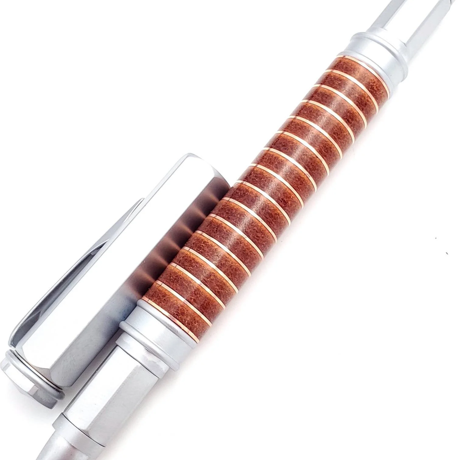 This pen is made from genuine cowhide leather stacked with copper rings between each layer. It is a tough but attractive looking pen and features a convenient magnetic cap making it a great every-day-carry.